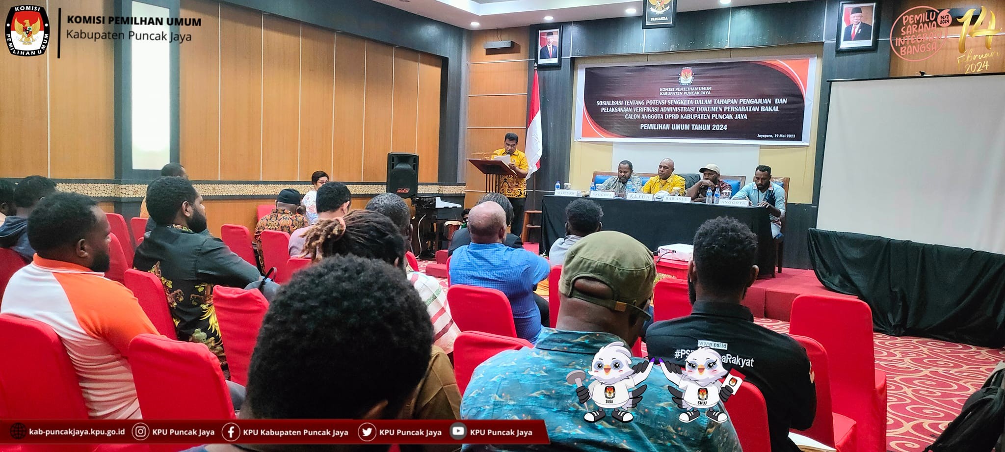 KPU KPU Kabupaten Puncak Jaya melaksankan sosialisasi tentang potensi sengketa dalam tahapan pengajuan dan pelaksanaan vermin dokumen bakal calon anggota DPRD. Jumat 19 Mei 2023 di Parkside Star hotel waena, Kota Jayapura. Turut menghadiri bawaslu puncak jaya dan 18 parpol peserta pemilu.